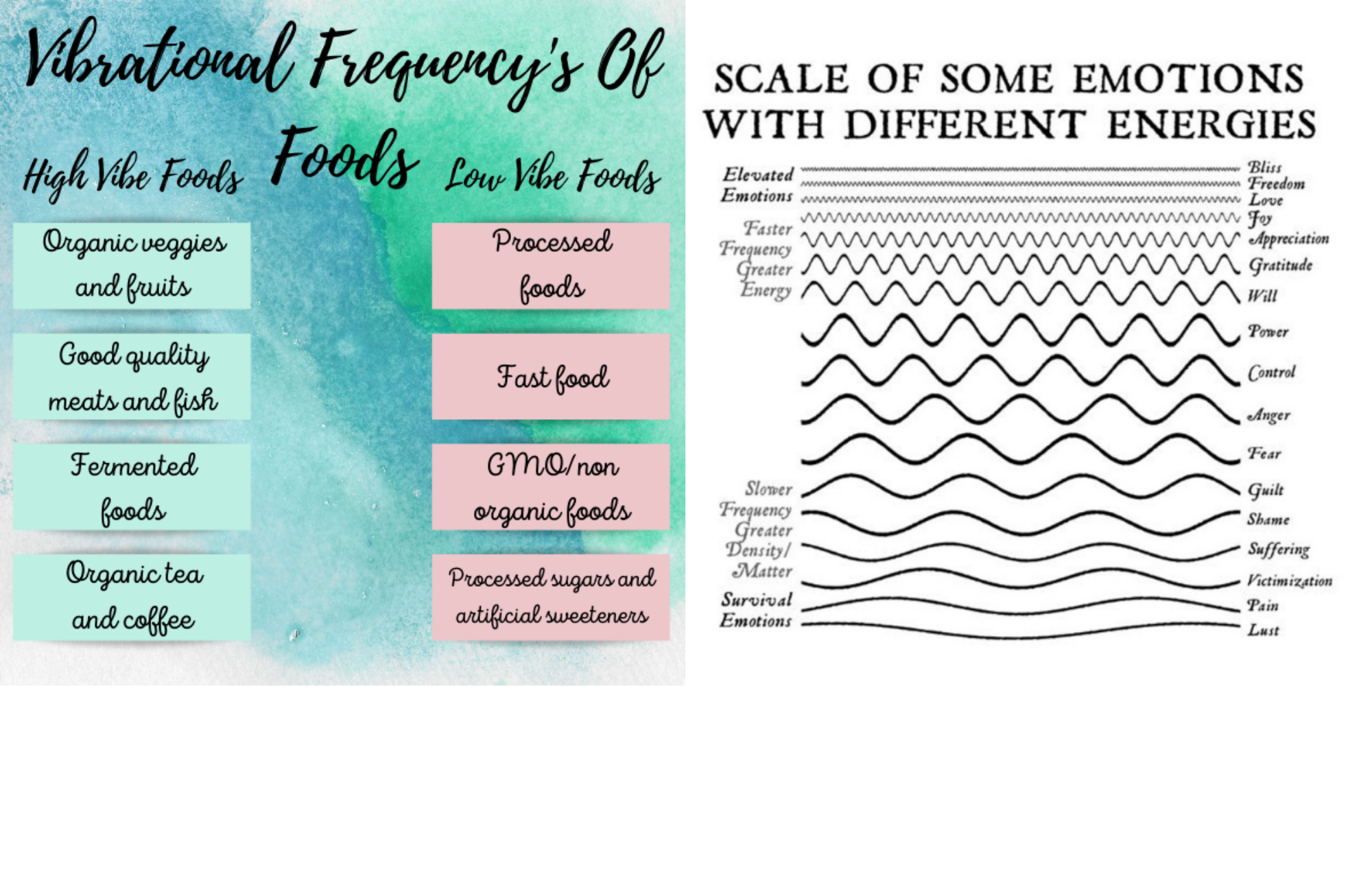 | Harnessing Those High Vibes Our high or low vibes are pretty much a frequency. Much like tuning into a radio station. Living in the mountains of North Carolina, I have noticed how variable the signal is on the radio in the car. On the way down the mountain, the signal often fluctuates from clear to static… and sometimes entirely changes. I’ve noticed that with myself, too – especially when I’m high vibing – something happens, I get a little static-y, and sometimes, I tune into the wrong vibe. Why? My frequency was way off. I allowed downer thoughts to come in. Then I actually entertained them like they were guests in my home! Then they robbed me blind, stealing my joy, leaving me with nothing but the same old familiar feelings, thoughts, and topping it all off with a big heaping pile of defeatism. To get the station that you want, you have to get tuned to the frequency that the station emits: – Your location counts. – The dial on the radio counts. In other words, there needs to be a match. The woo-woo expression for this is a vibrational match. Honestly, it’s just matching energy levels! And remember, everything has its own vibe, from food to emotions to your skin to the bricks in your home. Nothing is vibe-less. These two graphics show you just how high frequency works with food and emotion–really study them, they’ll blow you away! |